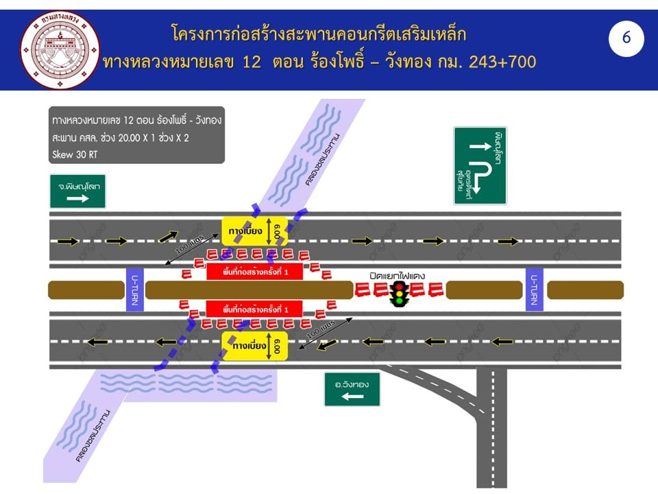 แขวงทางหลวงพิษณุโลกที่ 2 (วังทอง) ขอประชาสัมพันธ์ ด้วย ศูนย์สร้างและบูรณะสะพานที่ 1(พิจิตร) จะดำเนินการ กิจกรรมพัฒนาสะพานและระบบระบายน้ำ ก่อสร้างสะพาน คสล. และคอนกรีตอัดแรง ทางหลวงหมายเลข 12 ตอน ร้องโพธิ์ - วังทอง ระหว่าง กิโลเมตรที่ 243+700 (Lt.,Rt.)