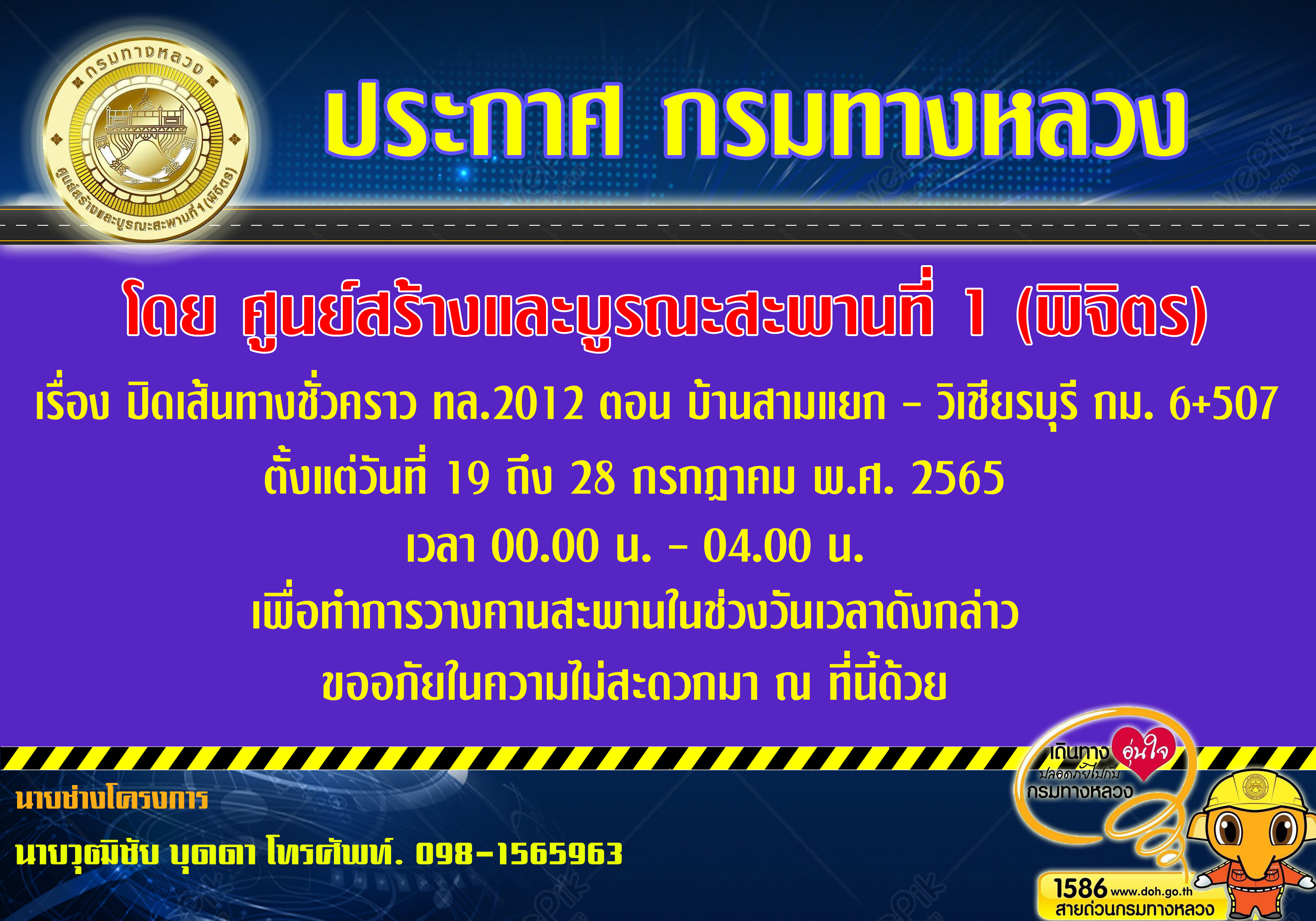 ประกาศ กรมทางหลวง โดยศูนย์สร้างและบูรณะสะพานที่ 1 (พิจิตร) เรื่อง ปิดเส้นทางชั่วคราว ทล.2012 ตอนบ้านสามแยก-วิเชียรบุรี กม.6+507 ตั้งแต่วันที่ 19ถึง28 กรกฏาคม พ.ศ.2565 เวลา 00.00-04.00 น. เพื่อทำการวางคานสะพานในช่วงวันเวลาดังกล่าว *** ขออภัยในความไม่สะดวกมา ณ ที่นี้ด้วย ***