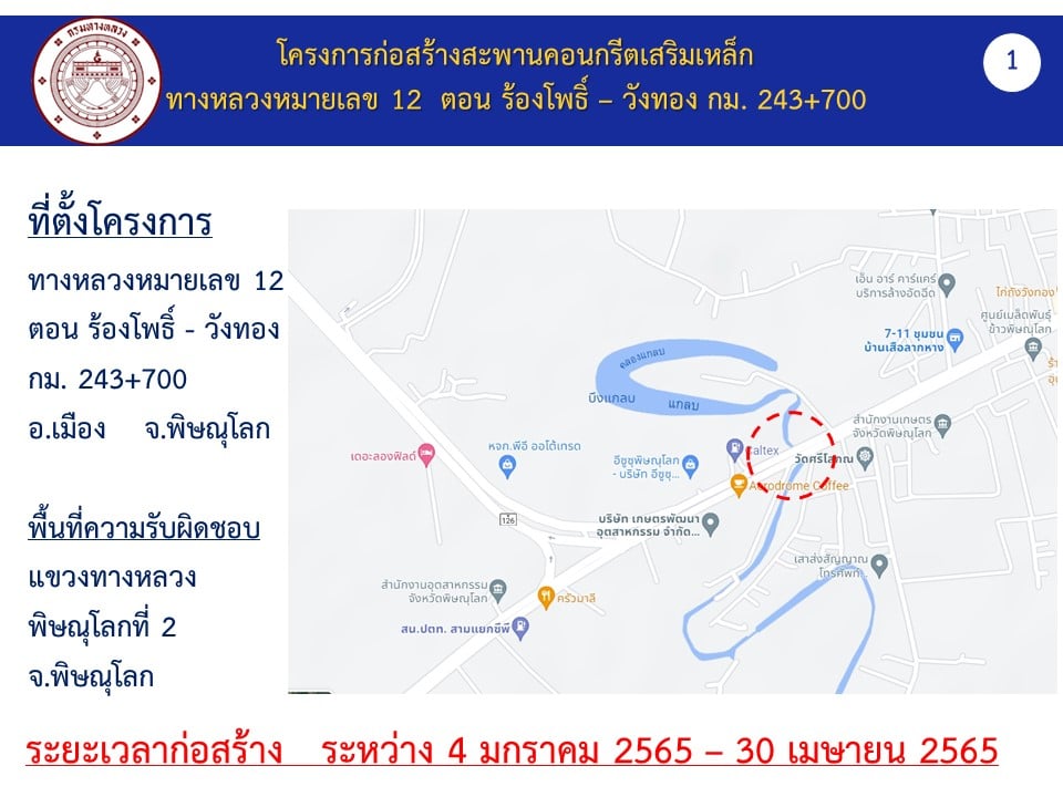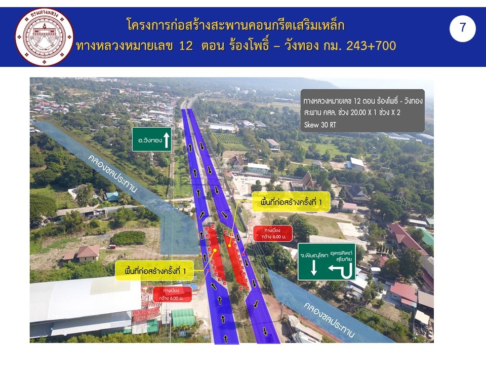 แขวงทางหลวงพิษณุโลกที่ 2 (วังทอง) ขอประชาสัมพันธ์ ด้วย ศูนย์สร้างและบูรณะสะพานที่ 1(พิจิตร) จะดำเนินการ กิจกรรมพัฒนาสะพานและระบบระบายน้ำ ก่อสร้างสะพาน คสล. และคอนกรีตอัดแรง ทางหลวงหมายเลข 12 ตอน ร้องโพธิ์ - วังทอง ระหว่าง กิโลเมตรที่ 243+700 (Lt.,Rt.)