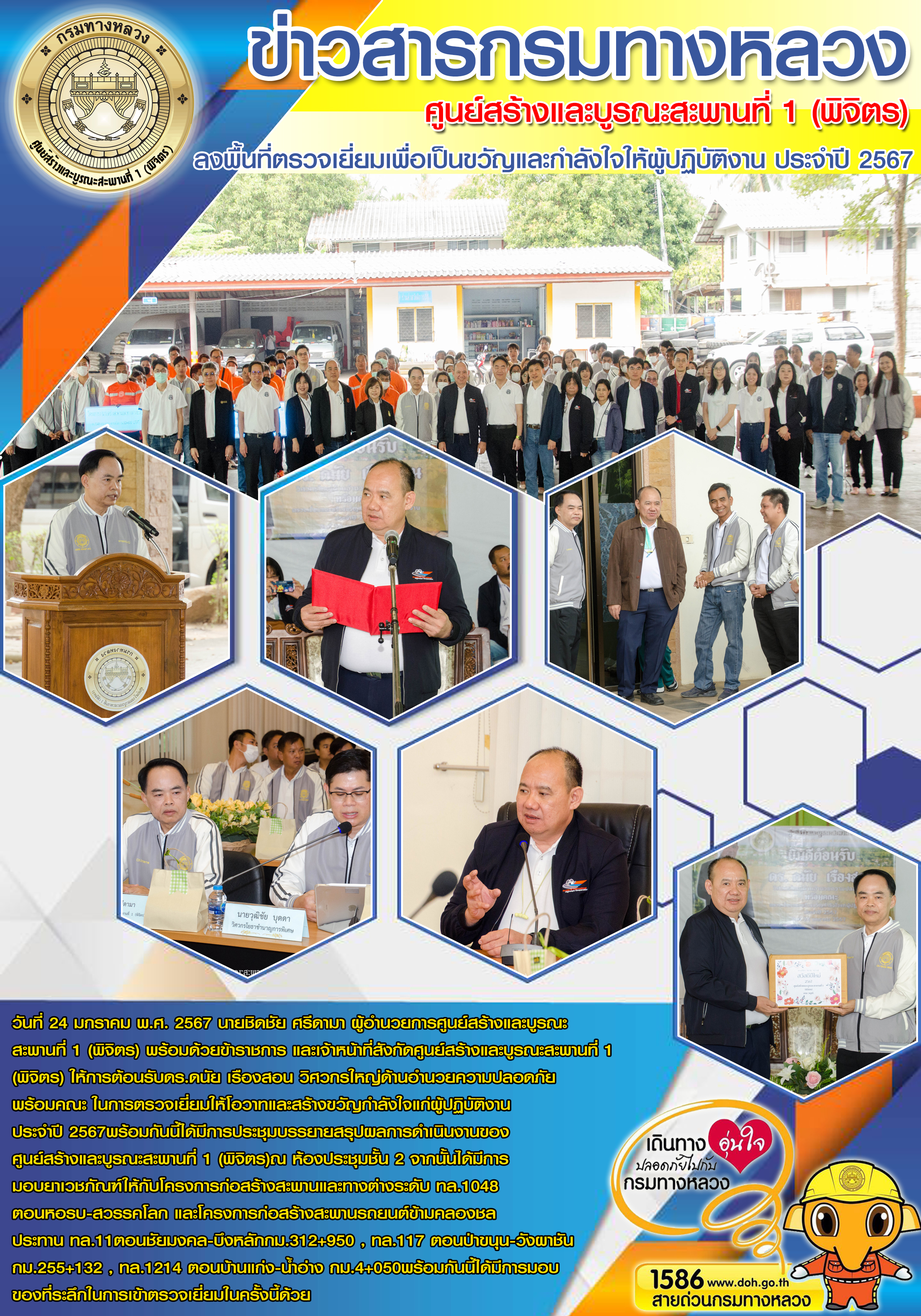 พร้อมด้วยข้าราชการ และเจ้าหน้าที่สังกัดศูนย์สร้างและบูรณะสะพานที่ 1 (พิจิตร) ให้การต้อนรับดร.ดนัย เรืองสอน วิศวกรใหญ่ด้านอำนวยความปลอดภัย พร้อมคณะ ในการตรวจเยี่ยมให้โอวาทและสร้างขวัญกำลังใจแก่ผู้ปฏิบัติงาน ประจำปี 2567พร้อมกันนี้ได้มีการประชุมบรรยายสรุปผลการดำเนินงานของศูนย์สร้างและบูรณะสะพานที่ 1 (พิจิตร) ณ ห้องประชุมชั้น 2 จากนั้นได้มีการมอบยาเวชภัณฑ์ให้กับโครงการก่อสร้างสะพานและทางต่างระดับ ทล.1048 ตอนหอรบ-สวรรคโลก และโครงการก่อสร้างสะพานรถยนต์ข้ามคลองชลประทาน ทล.11ตอนชัยมงคล-บึงหลัก กม.312+950 , ทล.117 ตอนป่าขนุน-วังผาชัน กม.255+132 , ทล.1214 ตอนบ้านแก่ง-น้ำอ่าง กม.4+050 พร้อมกันนี้ได้มีการมอบของที่ระลึกในการเข้าตรวจเยี่ยมในครั้งนี้ด้วย