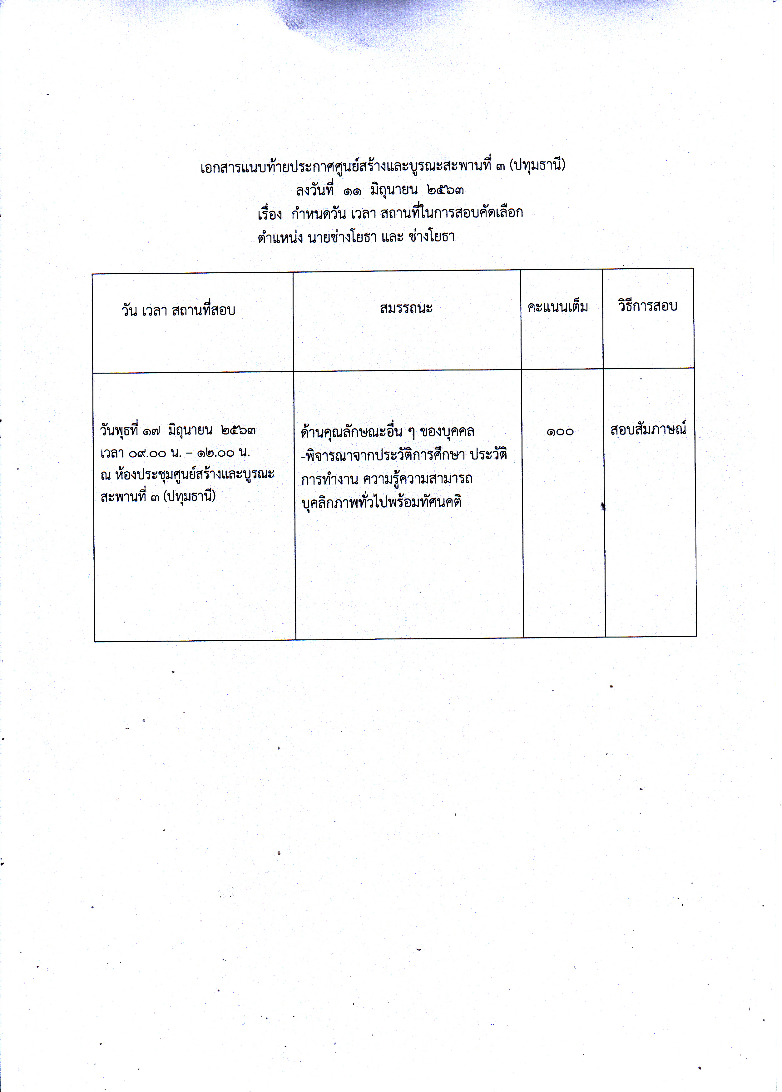 ศูนย์สร้างและบูรณะสะพานที่ 3 (ปทุมธานี )ประกาศรายชื่อผู้มีสิทธเข้ารับการสอบคัดเลือกเป็นลูกจ้างชั่วคราวในตำแหน่ง นายช่างโยธา, ช่างโยธา พร้อมแจ้งกำหนดวัน เวลา สถานที่ในการสอบคัดเลือก ดังเอกสารแนบ