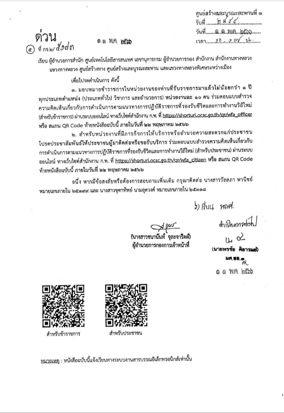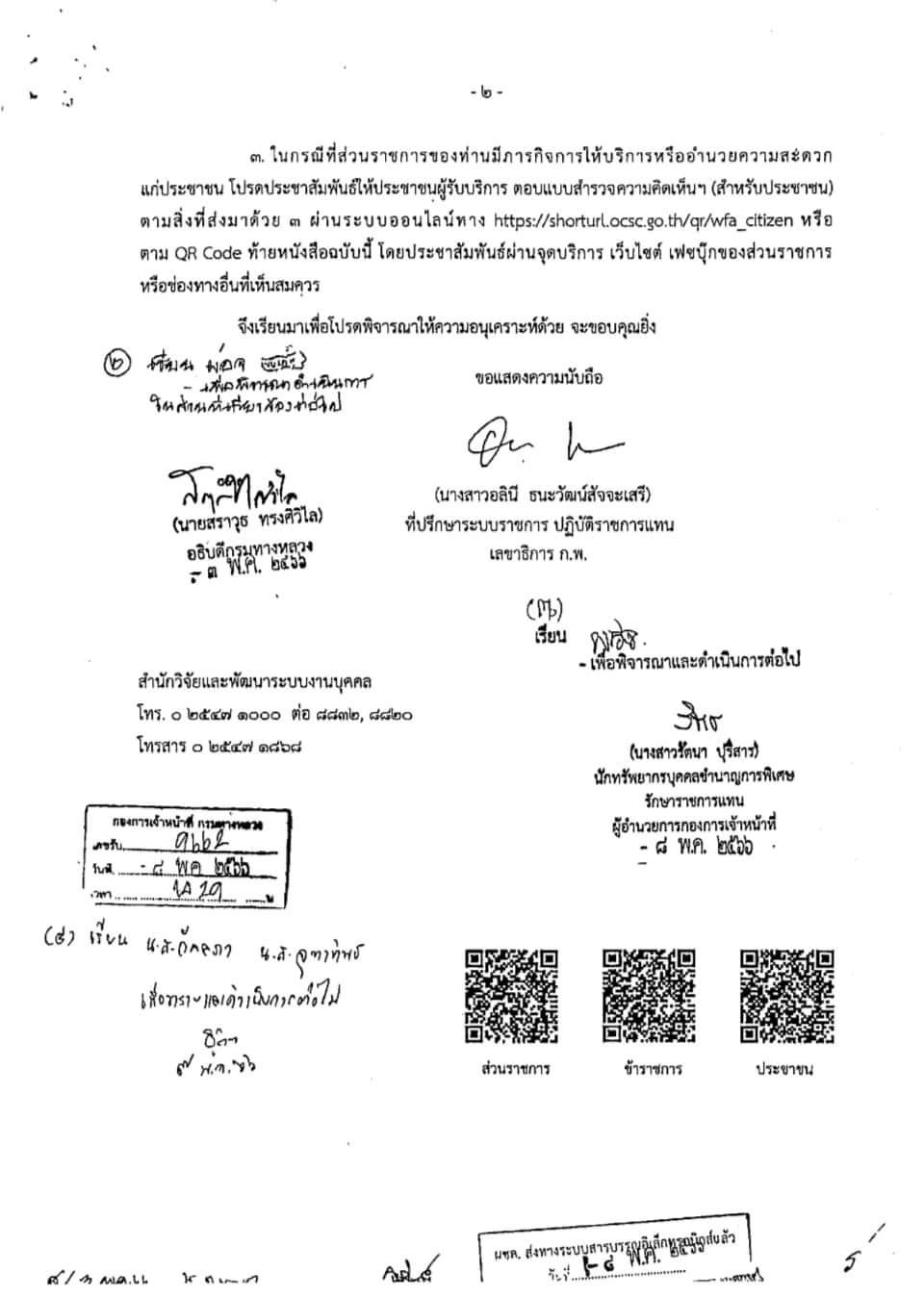 แบบสำรวจความคิดเห็นในส่วนของประชาชนที่ได้รับการบริการหรือการอำนวยความสะดวก สามารถตอบแบบสำรวจความคิดเห็นฯ (สำหรับประชาชน) ผ่านทางระบบออนไลน์ทาง http://shorturl.go.th/qr/wfa_citizan หรือ ตาม QR Code ท้ายหนังสือฉบับนี้