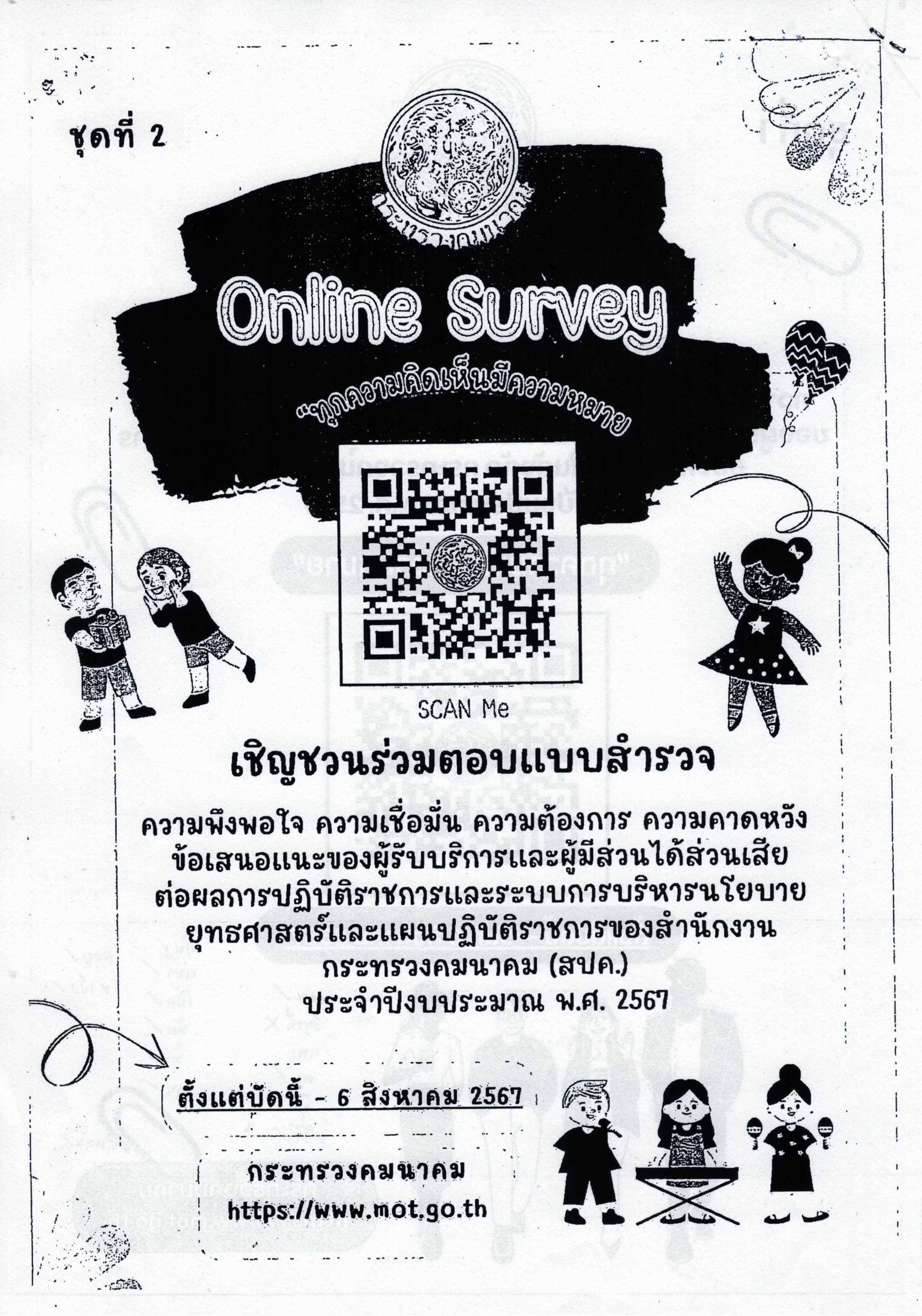 ขอชวนร่วมตอบแบบสำรวจ ความต้องการ ความคาดหวังและข้อเสนอแนะของผู้รับริการและผู้มีส่วนได้เสียต่อคุณภาพการให้บรอการของหน่วยงานในสังกัด การทรวงคมนาคม พ.ศ.2567