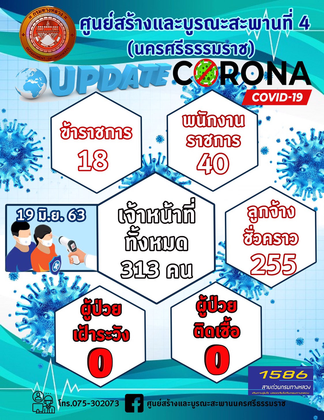 รายงานสถานการณ์...มาตรการ เฝ้าระวังการแพร่ระบาดของเชื้อไวรัส COVID-19 ของข้าราชการ พนักงานและลูกจ้าง ศูนย์สร้างและบูรณะสะพานที่ 4 นครศรีธรรมราช ....ประจำวันที่ 19 มิถุนายน 2563....