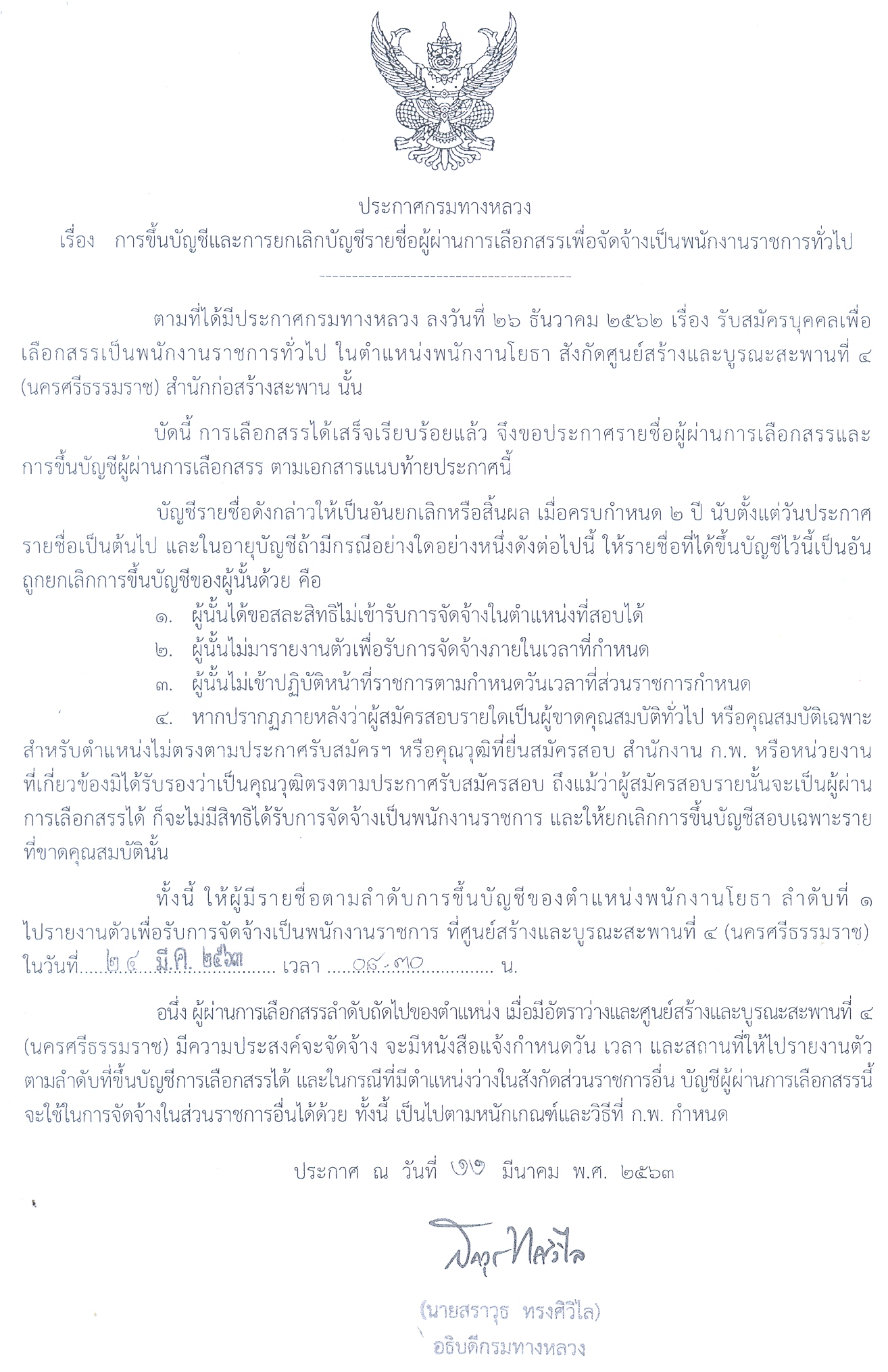 ประกาศกรมทางหลวง เรื่อง การขึ้นบัญชีและการยกเลิกบัญชีรายชื่อผู้ผ่านการเลือกสรรเพื่อจัดจ้างเป้นพนักงานราชการทั่วไป